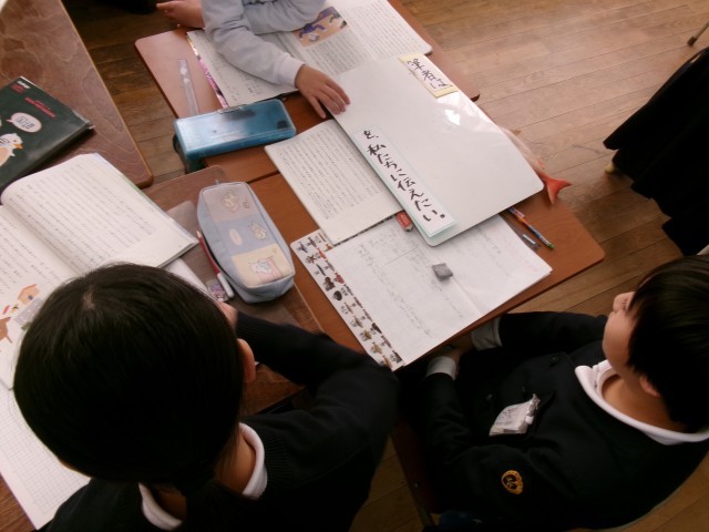 子どもたちは文章を読み、事例を比べ、その後、ペアで意見を交流しました。最後はグループで話し合い、筆者の思いを自分たちなりにまとめました。