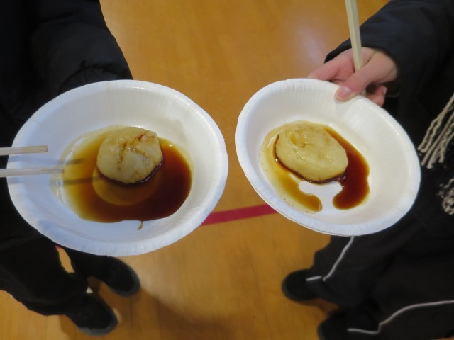 講堂では、つきたてのおいしいおもちをたくさんいただきました。おもちの種類がたくさんあり、子どもたちも「めっちゃおいしい!」と笑顔で大喜びでした。