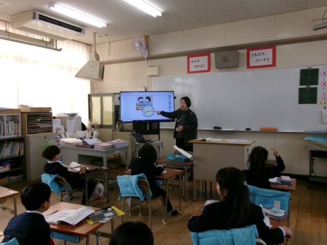ちょうどの時刻を読めるようになってきた1年生。今日は、一日の生活の時刻を読む学習に取り組みました。時計をよく見てみると、12までの数字のあいだに小さな目盛りがあることに気づき、「1は5分だから、2は10分になるんだ!」と、子どもたちの声があがりました。目盛りを読み間違えないように、えんぴつの先でおさえながら、ていねいに時刻を読むことができました。