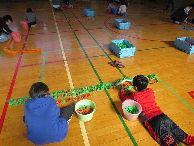 北鶴橋青少年指導員さん主催で「ドミノ大会」が行われました。グループごとに挑戦したドミノを最後は一つにつなげて倒します。完成のアイデアを出し合いながら、途中で倒れてしまわないように集中してがんばっていました。