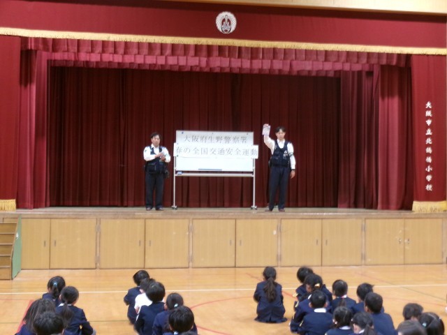 4月から自転車に関する新しい交通規制が始まりました。そんな中、いつも北鶴橋小学校の子どもたちを見守ってくださっている生野警察署の3人のおまわりさんが来校し、自転車事故を防ぐための大切なお話をしてくださいました。