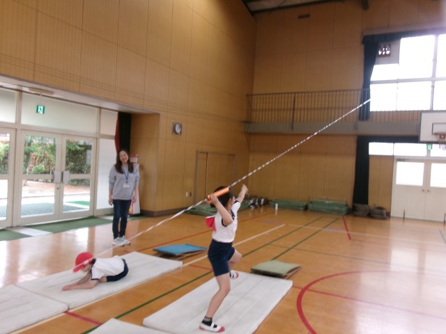 体育では、体づくりの運動をしたあと、バトンスローという方法を使って、ボールを遠く...