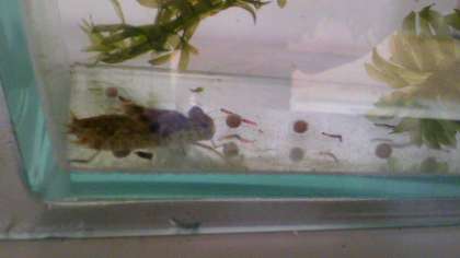 水が少なくなってくると、・・・いました。いました。ミズスマシやゲンゴロウ、ヤゴが見つかりました。水槽に入れて、校長室の靴箱の上へ。