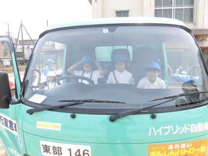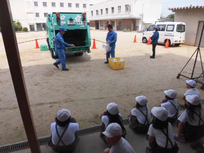 学校にパッカー車が来て、ごみの積み込み方や運び方など教えていただきました。