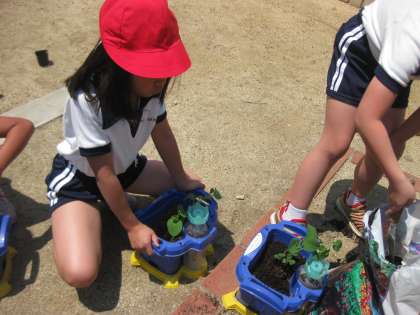 おくら、ピーマン、ミニトマト、えだまめなど、自分が育てたい苗を選び、育てます。優しく土をかぶせて「大きくなりますように」と心を込めながら鉢に植えていました!!