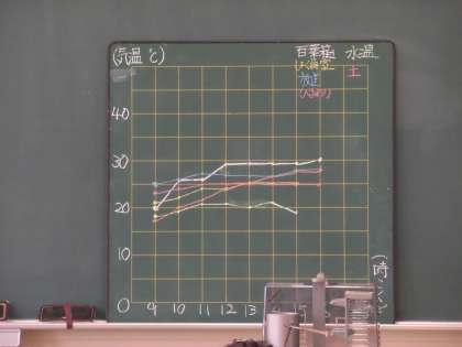 先週、学校の色々なところに温度計を置き、朝から夕方までの気温を場所別に調べました。