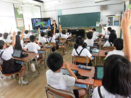 今日はタブレットを使って写真を撮り、自分の野菜の苗の特徴について発表しました。