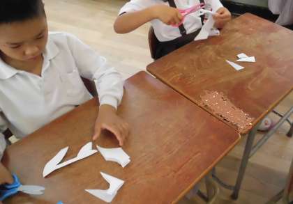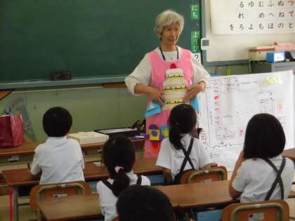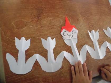 今日は、地域の方に来ていただいて工作を教えていただきました。重なった紙を切って、広げると、かわいいチューリップがつながってでてきました。歌の通り、「ならんだ〜ならんだ〜」のチューリップができあがりました。隣のお友達とも並べっこをして楽しみました。また、地域の方はエプロンシアターもしてくださって、子どもたちも大喜びでした。