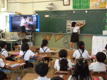 1年生は、学校探検でみつけた”とっておき”を発表しました。電子黒板に一人一人がタブレットで撮った写真や動画が写し出され、みんな緊張しながらしっかり発表できていました。最後は、みんな前に集まって話し合い、見つけた”とっておき”がものだけではなくて、人にも関わっていることに気付きました。