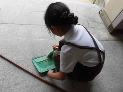 廊下の細かなごみは、小さいほうきでしっかりと!