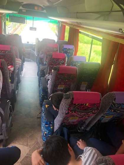 バスの中では、音楽が流れていて、静かに聴いている子や寝ている子、友だちと話をしている子など様々です。