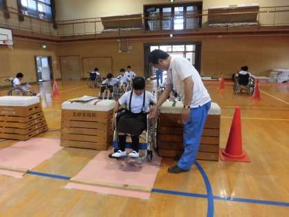 その後、体育館の跳び箱を障害物に見立てて、実際に乗ってみます。