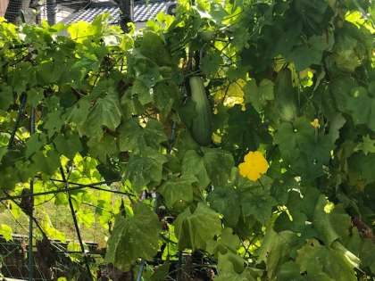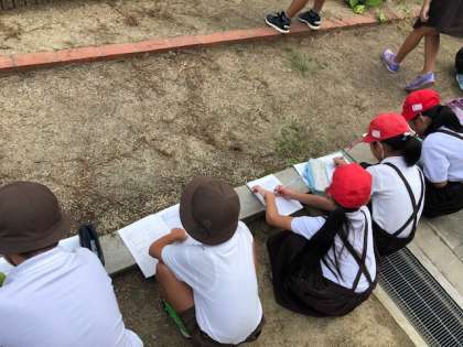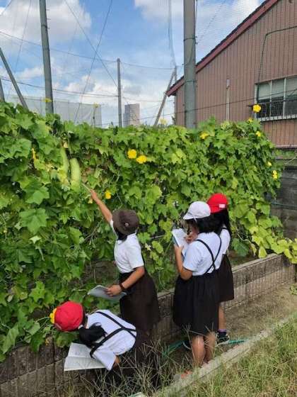 春にヘチマの種を植えました。そのヘチマが、夏になると花が咲き、ヘチマができました。今日はそのヘチマをよく観察し、観察カードに書きました。