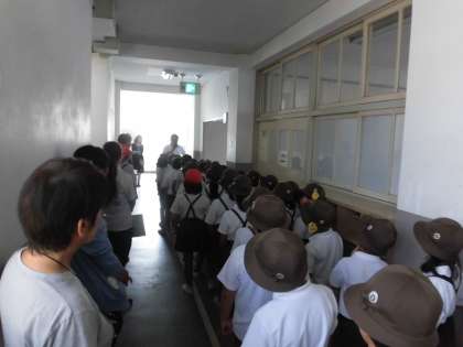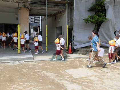 今日はお隣の鶴橋幼稚園の園児も参加し、地震や津波の時の避難の仕方について確認しました。