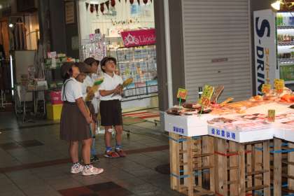社会や総合の学習で,商店街の学習をしています。今日は第1回めの商店街見学です。どんな店が並んでいるのか,商店街の工夫は何かなどを調べました。商店街に来ている人にもインタビューをしました。みなさん,優しく答えてくださいました。