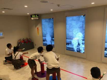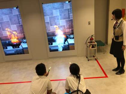 地震が起きた時、ガスの元栓を閉めたりブレーカーを落としたりすることが大切だということを学びました。その後、消化器の使い方を教えていただき、消火体験をしました。