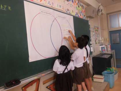 その後は教室で、この前行ったスーパーマーケットと同じところや違うところを話し合いました。