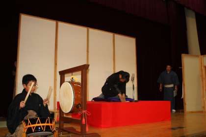 落語家さんの噺の前には、代表児童による小噺の披露もありました。全学年の注目が集まるなか、出囃子太鼓の演奏と小噺をそれぞれの児童が熱演しました。