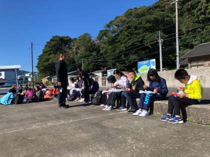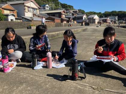 釣りが終わり、海の近くで朝ごはん!
