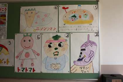給食委員会では、もっと給食を好きになってもらおうと、食材にちなんだキャラクターを作ることにしました。このキャラクターは学校の掲示板に貼りだされていて、投票で給食委員会のキャラクターとして選ばれます。