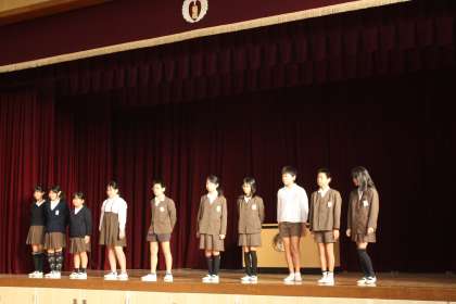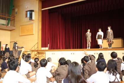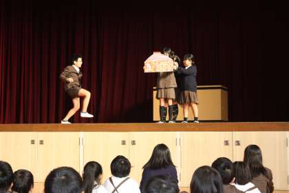 図書委員会は、読書集会で本にちなんだクイズをしました。「3匹の子ぶた」「桃太郎」「ヘンゼルとグレーテル」「シンデレラ」「かちかち山」を劇にして紹介しました。