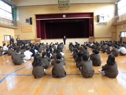 今日の児童朝会では、桃谷中学校の生徒会の生徒が来て、お礼とお知らせに来てくれました。