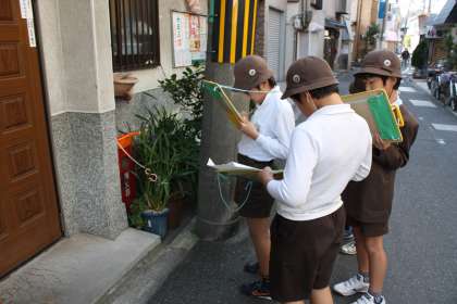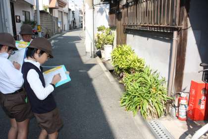 4年生は、総合的な学習で「防災」について学習しています。自分たちがどこにいても消火活動ができるように、地域に設置してある消火器や消火バケツの場所を確認しました。