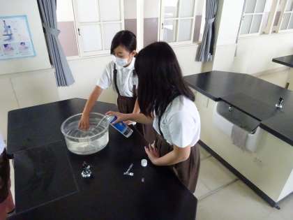 今日の理科は、水上置換法で集気ビンに酸素を入れる方法を学習しました。