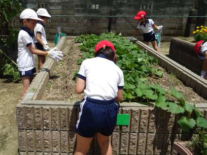 生活科で、サツマイモを育てている子どもたち。教科書には、大きく立派なイモを作るために、草抜きをしよう。と書いてありました。