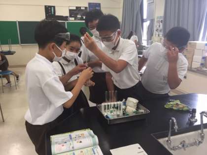 6年生は理科で水溶液の性質について学習しています。金曜日は5種類の水溶液に対し、「見た目」「におい」「熱したときに蒸発皿に残ったもの」を調べ、いくつに仲間分けすることができるか考えました。さすが6年生、チームワークで手際よくすすめています。
