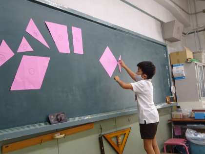 今日は、いろいろな三角形や四角形を使って、かたちづくりをしました。
