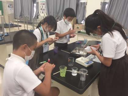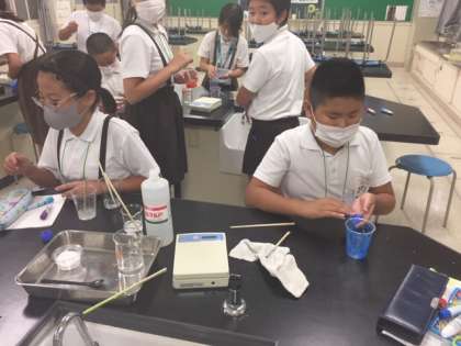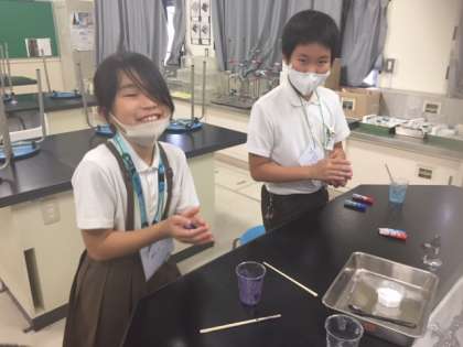 本日の科学クラブは、スライム制作をしました。水と水のりを混ぜたものに、ホウ砂を溶かした水溶液を入れて混ぜると出来上がります。そこで本日のめあては「ホウ砂水の量で、スライムのかたさはどのように変わるのだろうか?」。ホウ砂水の量を変えて、2種類のスライムを作ってみました。好きな色の絵の具を混ぜて作っています。