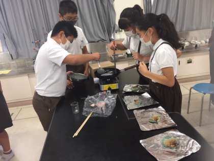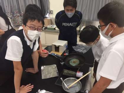 本日の理科の学習です。5時間目は水溶液は酸性・中性・アルカリ性の3つの仲間に分けることができることを確認し、タブレットを使い以前作成した仲間分けのフローチャートを完成させました。6時間目はその応用。普段何気なく食べている料理にもいろいろな科学が関わっているんだということを、実験を通じて学習しました。