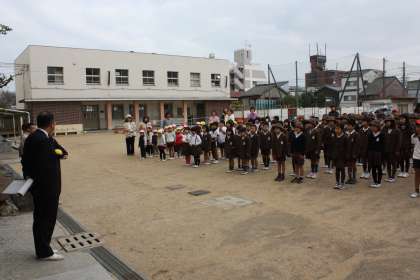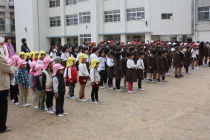 地震発生を想定し、緊急時の避難訓練を幼稚園と連携して行いました。明日は、阪神大震災から数えて20年目の節目の日です。子どもたちは、命の尊さや、普段からの災害の備えについて考えました。