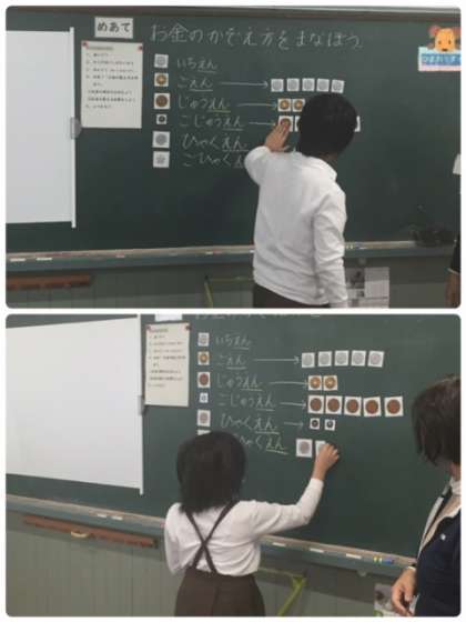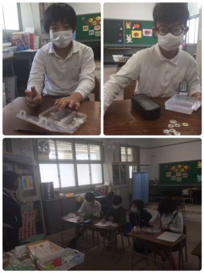 今日は「あいうえおにぎり」で声を出す練習をした後、「お金の数え方」について学習しました。コインケースに硬貨を分けて入れたのち、「8円を5円玉と1円玉で払うときは、どの硬貨を何枚使う?」といった問題にチャレンジ。いつか、みんなで本物のお金をもって、お買い物に行けたらいいね。がんばろう!