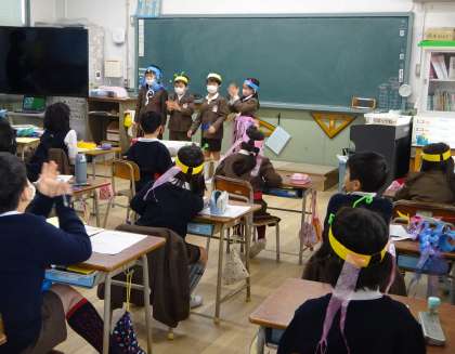 画用紙の短冊を輪にしたものを使って、素敵に変身しました。リボンをつけたり、モールをつけたりと、それぞれ工夫した作品が出来上がりました。学習の最後は、ファッションショーをしました。