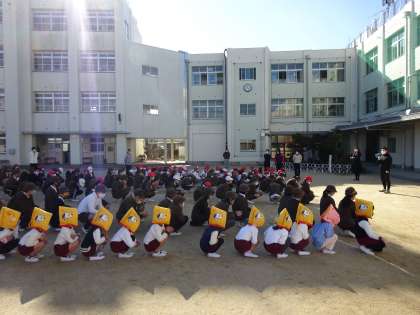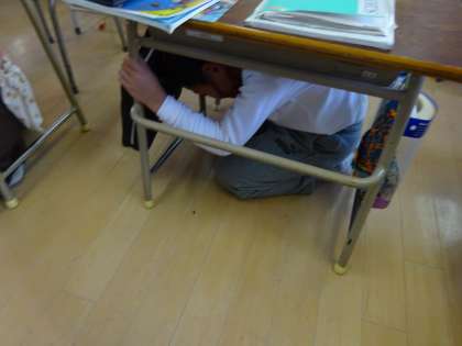 休み時間に児童への予告なしに訓練をしましたが、みんな放送をよく聞いて、机の下にもぐり、頭を守る行動がとれました。