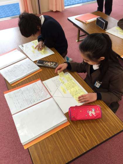5年生は、木楽荘での活動をふり返り、ピラミッドチャートを使って、自分の成長を伝えるという学習でした。