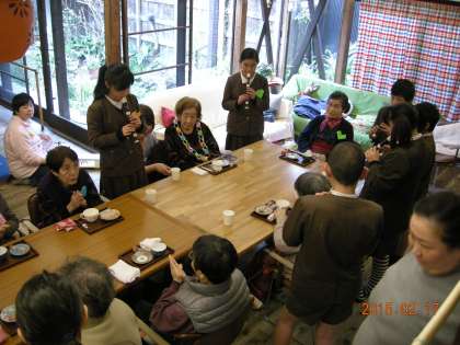 この一年間、ふれあってきた利用者さんに感謝の気持ちをこめて、昔あそびをしたり、お茶を入れ会話を楽しんだりしました。「もう終わりと思うとさみしいなあ」「今日来てくれると思うと、朝から楽しみやったわ」「もっと続けて来てほしいのに」と、うれしい声をかけていただきました。子どもたちも「いつまでもお元気でいてください」「○○さんのことは一生忘れません」「私たちのことも覚えていてください」と伝えました。