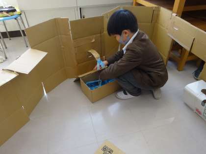 いよいよ学習のまとめの時期です。図画工作科では、ダンボールを材料に、これまでに学習したことを生かして作品を作りました。グループで協力して、大きな作品を作ります。初めて使うダンボールカッターも安全に使うことができました。ベッドや電子レンジもある快適な家や、扉を開けるとかわいいワンちゃんが出迎えてくれる家など、素敵な作品が出来上がりました。中には、手洗い場を作ったグループもあり、感染症が流行するこの時期でも安心です。