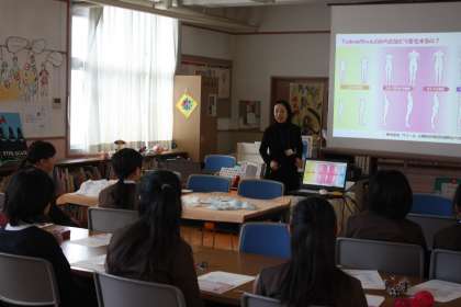 ワコールの方を講師に、思春期にともなう体の成長について学びました。成長期を迎えると、胸やお尻が発達し、体全体が丸みを帯びて“赤ちゃん”を産む準備が始まることを分かりやすく説明していただきました。また、発育には個人差があることや、下着も自分に合ったものを身に着けるのが大切だということを教えていただきました。