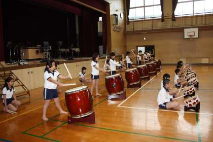 先生のかけ声のもと、長胴太鼓と占め太鼓でリズムを合わせて打ちました。今までの中で一番格好よく、そして講堂中に響きわたる力強い音色でした。みんなで心を一つに合わせて演奏ができました。保護者の方に見てもらうのが楽しみです。