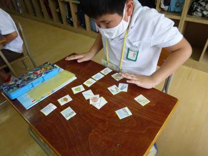 天気カードを使って、晴れの日や雨の日の服装や遊びを