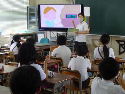 昨日から、全学年でイングリッシュタイムが始まりました。リズムよく歌ったり、物語から聞こえてきた単語を確かめたり、簡単な英語の質問に答えたりと学年に応じて様々な活動をしました。これから、毎週水曜日に実施します。ご家庭でも話を聞いてみてください。