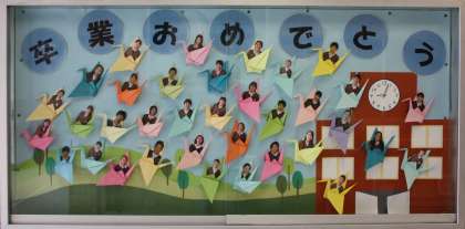 玄関掲示が「卒業おめでとう」の掲示になりました。6年生の卒業をお祝いして、鶴と写真がきれいに飾られています。卒業式の練習が進む中、自分たちが飾られているこの玄関掲示を見て、6年生も卒業することへの実感が増してきたようです。