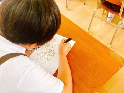 手のスケッチは毎週末の宿題に出されており、子どもたちはこれまでに何度も描いてきたので、スラスラとマイネームを走らせて描くことができていました。