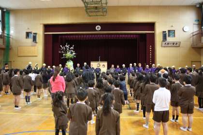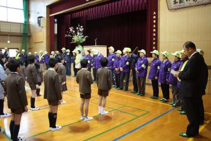 集会では、見守り隊の方々の自己紹介や、登下校時の安全についてお話をしていただきました。6年生の代表があいさつをし、全員で校歌を歌いました。