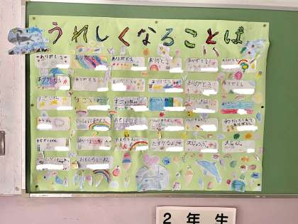 国語科「うれしくなることばをあつめよう」の学習では、お家の人や友だちに言われると嬉しくなる言葉を考え、発表しました。