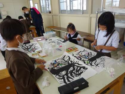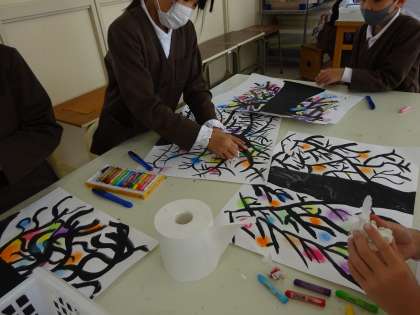 国語科で学習している「モチモチの木」を図画工作科で描いています。クレヨンをカッターナイフで削って、ペーパーでくるくると広げながらぼかしていきます。真っ黒だった木に美しい灯がともり、みるみるうちに素敵な「モチモチの木」となりました。