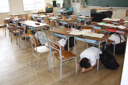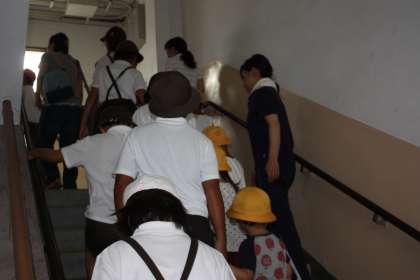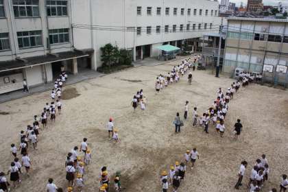 一次避難が地震を想定して運動場へ、二次避難が津波を想定して校舎への避難を行いました。高学年は、鶴橋幼稚園の園児との避難でしたが、手をつなぎ、上手に避難場所への移動することができました。